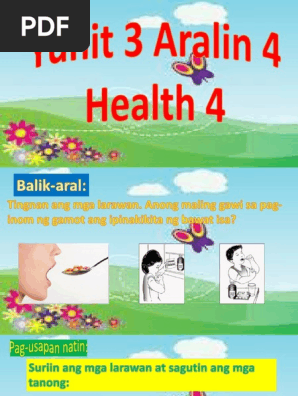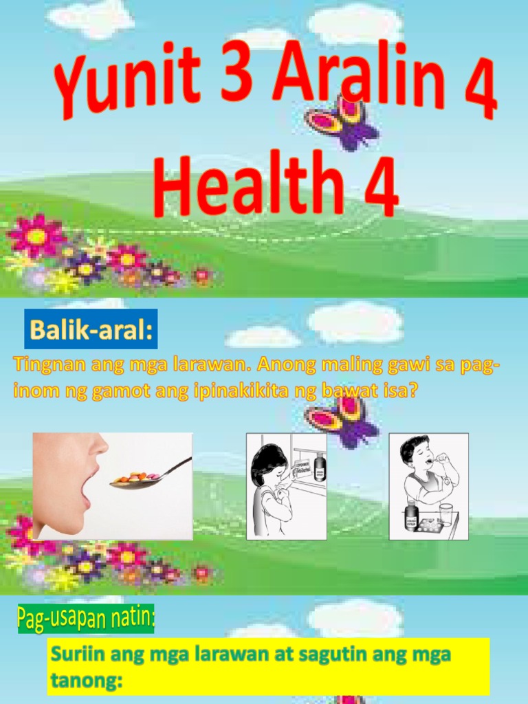 Ang iba naman ay tatlo o anim. Sa hudyat ng guro mag-unahang pumunta sa harap ang limang bata at hanapin sa kahon ang larawan o bagay na kaugnay sa kaisipan sa tamang pag-inom ng gamot. Sa tuwing tayo ay nagkakasakit nais lamang natin ay ang agarang paggaling.
